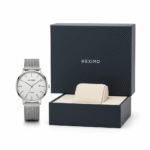 En KEXIRO automatisk klocka, en elegant presentask, ett justeringsverktyg för armbandet, och en användarmanual med garantibevis.