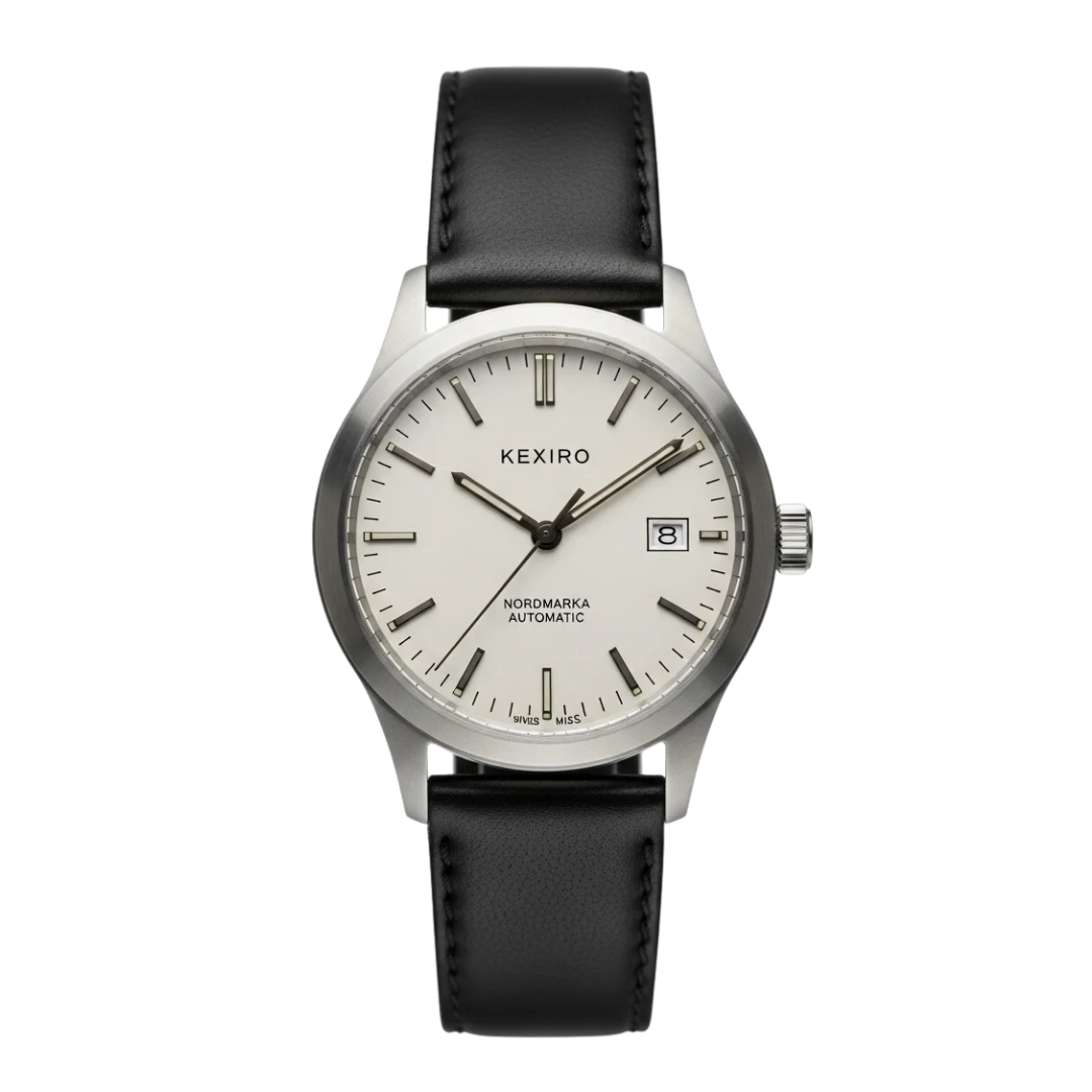 KEXIRO Nordmarka är en robust och pålitlig automatisk fältklocka, designad för den moderna äventyraren. Med sin minimalistiska skandinaviska design och ett självuppdragande urverk är den byggd för att tåla både naturens prövningar och vardagens utmaningar. En perfekt följeslagare för dig som värdesätter funktion, hållbarhet och tidlös stil.