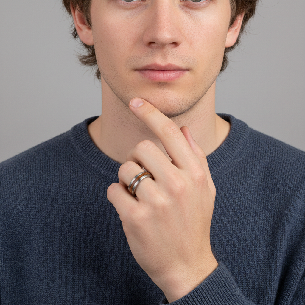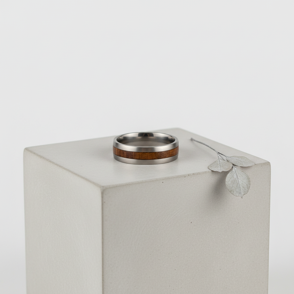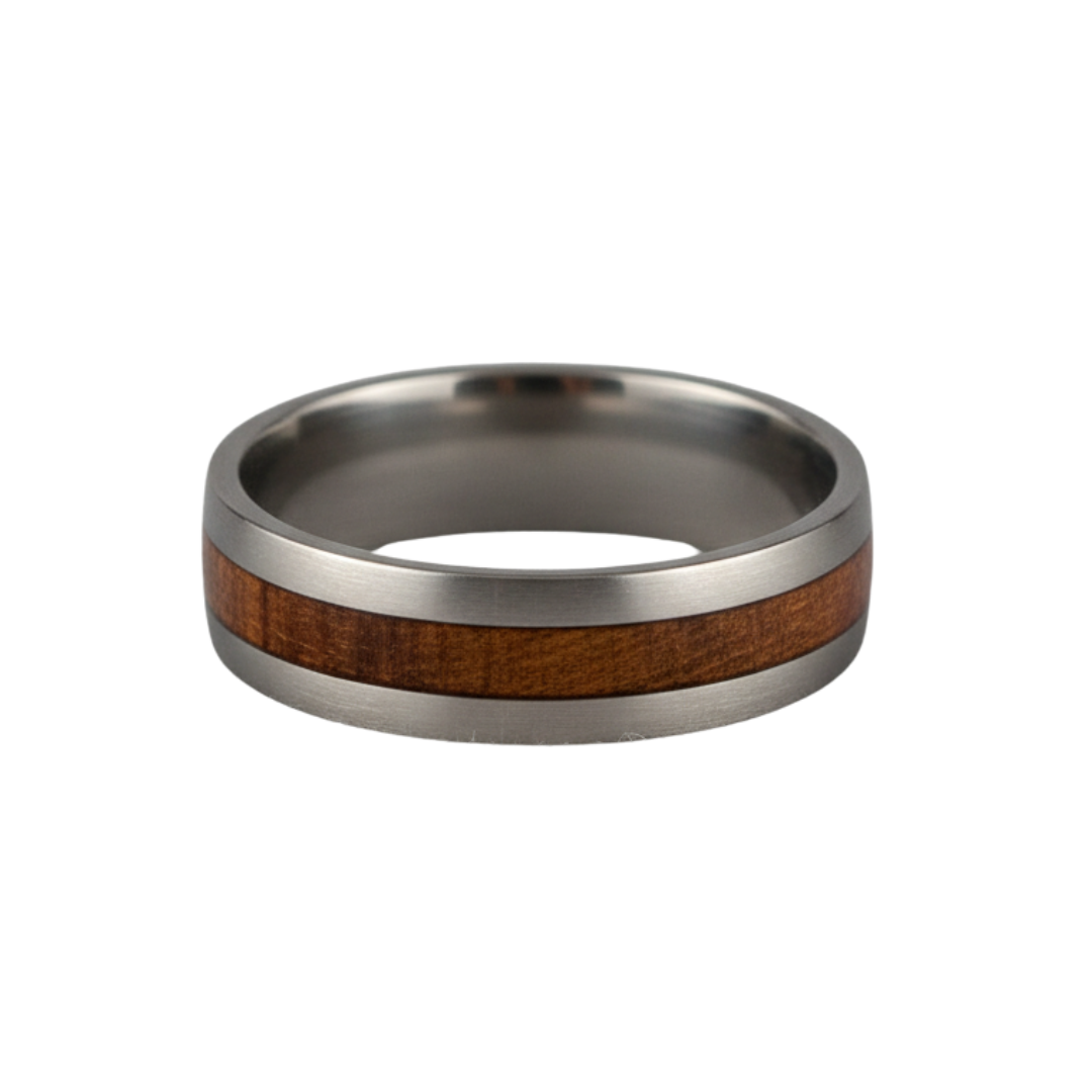 Tundra Band-ringen är en fusion av modern design och naturlig skönhet, skapad med hållbarhet i åtanke. Dess robusta konstruktion av återvunnen titan och det varma valnötsträinlägget gör den till en idealisk accessoar för den medvetne bäraren som söker både stil och funktion. En perfekt unisex-ring för att lägga till en touch av sofistikerad enkelhet under den kalla säsongen.