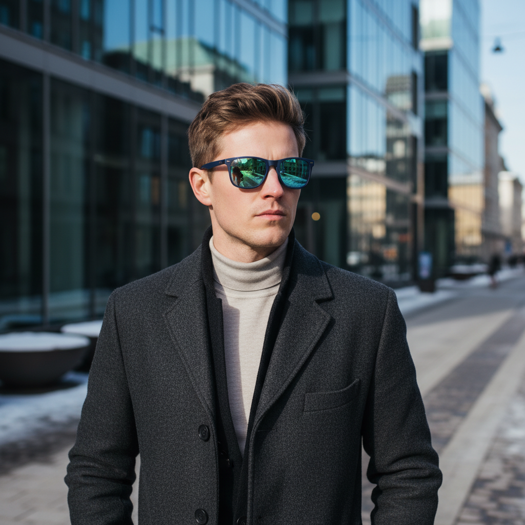 Dessa solglasögon med spegelglas är utformade för att erbjuda optimalt skydd och en modern stil för den urbana mannen. De kombinerar robust funktionalitet med en distinkt estetik, perfekta för kalla vinterdagar med lågt stående sol och reflekterande snölandskap. En idealisk accessoar för den medvetne individen som värdesätter både prestanda och design.